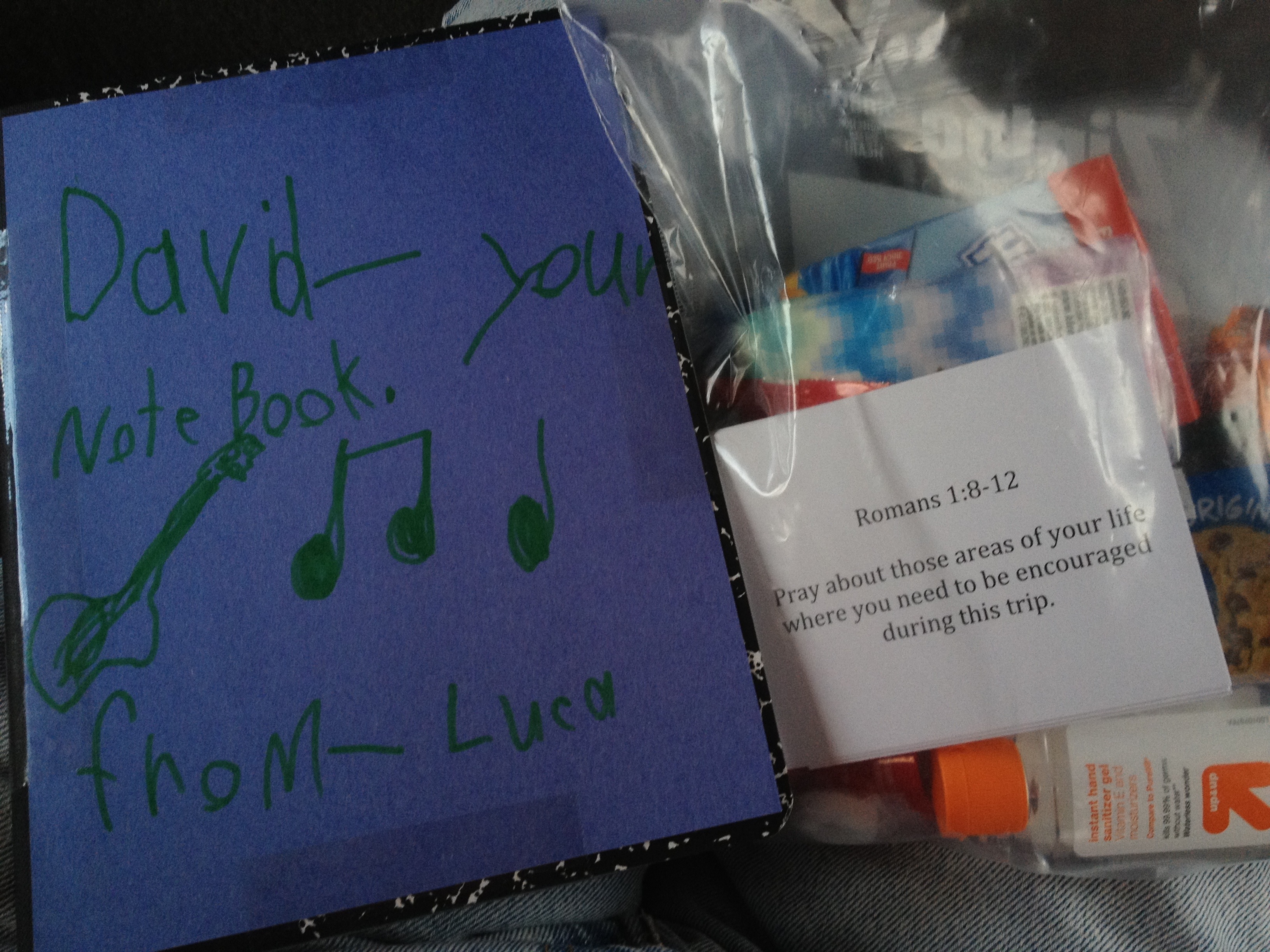 Sunday, April 22nd, 2012Remember the picture from when we left this morning? Did you see what we were all holding? They were care packages made from Marsh Creek Church Youth. Each one of us got our own individual package, including a decorated notebook for a journal, a collection of notecards with encouraging verses, and a bunch of snacks. So cool. Thanks, youth!!
